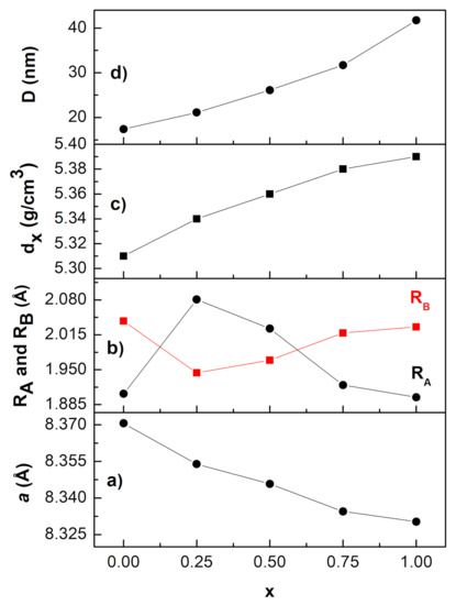 where , , , and represent the shape factor ( for spherical particles), the wavelength of the X-ray radiation ( Å), the diffraction angle, and the FWHM measured in radians. Figure 3d depicts the crystallite size variation with Ni content for all ferrite compositions. As can be seen in the figure, the crystallite size increased as Ni content increased, most likely due to nickel’s tendency to interact with oxygen anions during grain growth. The crystallite size increased from 17.4 nm to 41.7 nm as x increased from 0 to 1. For the same ferrite composition, but prepared by the sol–gel method, the crystallite size increased from 36 nm to 58 nm as x increased from 0 to 1 [23].