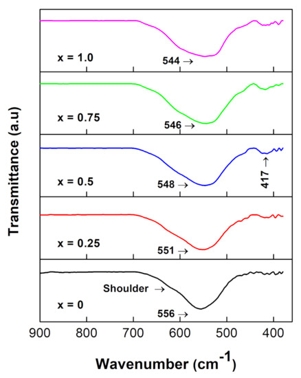 The obtained FT-IR spectra for all ferrites are shown in Figure 5. “For spinel ferrites, four modes of vibration are expected to occur in the , , and regions” [5]. Two prominent metal–oxygen bands may be recognized in the figure at frequencies of 556 and 417 . The higher frequency band was created by the stretching vibrations of the metal–oxygen bond in the tetrahedral sites. The metal–oxygen vibrations in the octahedral sites created the lower-frequency one. These two absorption bands confirmed that a single-phase spinel structure with two lattices centered at the tetrahedral and octahedral sites was formed [10]. The tetrahedral region in all ferrite samples had a shoulder peak at ∼600 , suggesting that the tetrahedral sites were most often occupied by more than one type of cation, as shown in the figure. As a result, the ferrite nanoparticles produced were very likely to have mixed spinel-type structure. As Ni content increased, the high-frequency peak shifted slightly to the low-frequency regions: 556 cm, 551 cm, 548 cm, 546 cm, 544 cm. The last two absorption bands ( and ) were not visible because they were outside the wave number range of the FT-IR machine that was used to collect the FT-IR absorption spectra.