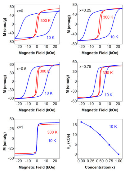 The magnetic hysteresis loops of the ferrites with are shown in Figure 6. These loops were recorded in a magnetic field of up to 25 kOe at various temperatures. All ferrite samples were in a single ferrimagnetic phase between 300 K and 10 K, as shown in the figure. The RT coercivity of the ferrites was observed to decrease from (∼770 Oe) for cobalt ferrite (x = 0) to (∼42 Oe) for nickel ferrite (x = 1). This was expected because cobalt ferrite is a hard ferromagnetic material characterized by high coercivity, whereas nickel ferrite is a soft ferromagnetic material characterized by low coercivity. These measured values of RT coercivity of the end samples were consistent with the reported values of 890 Oe for cobalt ferrite and 50 Oe for nickel ferrite [25]. It is also clear from the figure that ferrimagnetism of ferrite nanoparticles with was strongly temperature dependent. The of (∼17 kOe) was substantially higher than that of bulk (6.8 kOe) at 10 K [26], indicating that these ferrite nanoparticles were truly single-domain nanoparticles. The small value of of the ferrite and its very weak temperature dependence suggested that this sample was in a multi-domain regime. Furthermore, at 10 K, as seen in the lower right corner of Figure 6, the coercivity of all ferrite samples reduced with increasing Ni concentration, going from ∼17 kOe to ∼0.15 kOe as x increased from 0 to 1. As ions of the hard magnetic material (Co) were continuously replaced by ions of the soft magnetic material (Ni), such a reduction in coercivity was to be expected.