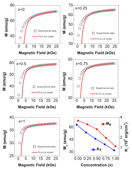 When a large magnetic field of 25 kOe was used, Figure 6 clearly illustrates that the magnetization was not saturated. As a consequence, we determined the saturation magnetization () and the first anisotropy constant () using the law of approach to saturation (LA). “This approach is typically good for describing magnetization near saturation and is valid at fields much higher than the coercive field () [5]. The magnetization () near the saturation is determined by:
