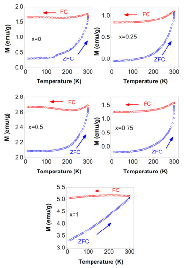 ZFC–FC magnetization curves of the ferrites with , recorded with a magnetic field of 100 Oe.