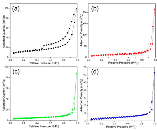 N2 adsorption desorption isotherms of hierarchical ZnO microspheres prepared at (a) RT and annealed at (b) 300, (c) 400, and (d) 500 °C.