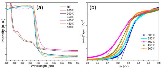 (a) UV-visible absorption spectra and (b) plots of (αhv)2 vs. hv for the hierarchical ZnO microspheres prepared at different annealing temperatures.