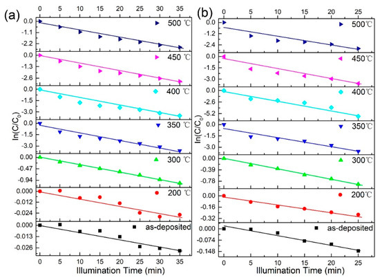 Moreover, the photodegradation reaction kinetics follow the pseudo-first-order kinetics equation [33]: In (C/C0) = −kt, where k and t denote the degradation rate constant and reaction time, respectively. The kinetic fits to the experimental data are shown in Figure 9. The fit is reasonably linear, thus, the photodegradation rates, k1 and k2, for RhB and MB were obtained from the gradients of the fits to the data (see Table 1). The fastest rates, 0.1021 and 0.217 for RhB and MB, respectively, were obtained for the catalyst annealed at 400 °C. As shown, the degradation rate of MB is twice that of RhB.