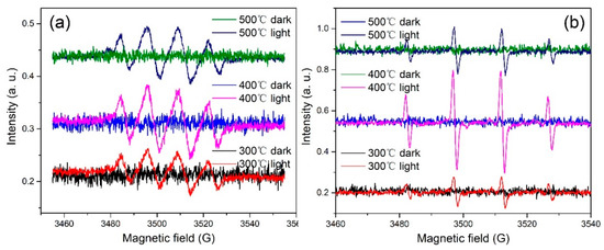 To verify the mechanism proposed above, EPR spectra of the catalysts in the dark and under illumination were collected, as shown in Figure 11. No EPR signals were observed in the dark. In contrast, under illumination, signals corresponding to DMPO-·OH and DMPO-O2− were observed, and the EPR signal intensity of the catalyst annealed at 400 °C was the strongest, indicating that the sample generated the most DMPO-·OH and DMPO-O2− on light irradiation. These results are consistent with the proposed photodegradation mechanism.