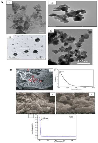 Electron microscopy and UV-Vis images of select nanoparticles. (A) Range of sizes of select Co3O4 nanoparticles and their nanocomposites: (i) transmission electron microscope micrograph of Co/Co3O4 nanocomposites synthesized according to the sonochemical method (∼20 nm in size). This image was adapted from Yousefi et al. [51] with permission from Elsevier. (ii) Transmission electron microscope micrograph of α-Fe2O3/Co3O4 nanocomposites synthesized via the co-precipitation method (average crystallite size of 25.34 nm). This image was adapted from Bhushan et al. [50] under the open access Creative Common CC BY license of Springer Nature. (iii) High-resolution transmission electron microscope image of myco-synthesized Co3O4 nanoparticles (20–27 nm in size). This figure was adapted from Omran et al. [3] with permission from John Wiley and Sons. (iv) Transmission electron microscope image of plant extract-synthesized Co3O4 nanoparticles (size 15–35 nm). This image was adapted from Hafeez et al. [7] under the open access Creative Common CC BY license of IOPScience. (B) Morphology and spectra of select Co3O4 nanoparticles used in antibacterial applications: (i) field scanning electron microscope micrograph of myco-synthesized Co3O4 nanoparticles showing their spherical-like morphology. (ii) UV/Vis absorption spectrum of myco-synthesized Co3O4 nanoparticles showing a distinct absorption peak at λ280nm. These images were adapted from Omran et al. [3] with permission from John Wiley and Sons. (iii,iv) High-resolution scanning electron microscope micrographs of spherical, agglomerated Co3O4 nanoparticles. (v) UV/Vis/NIR absorption spectrum of Co3O4 nanoparticles showing an absorption peak at λ208nm. These images were adapted from Mayakannan et al. [39] with permission from Elsevier.