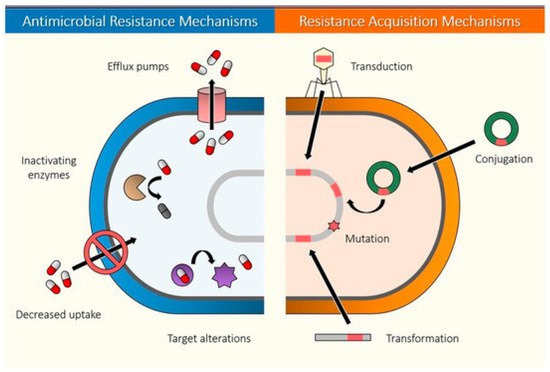 Mechanism of antibiotic resistance in antibiotic-resistant bacteria. Antibiotic-resistant bacteria may neutralize antibiotics via different mechanisms such as inactivating enzymes, altering their permeability to reduce antibiotics taken into the cell, eliminating antibiotics that enter the cell using efflux pumps, decreasing uptake of antibiotics, and modifying the targets of the antibiotics. Bacteria may acquire these resistance mechanisms via transduction, conjugation, mutation, and transformation. Reprinted from Álvarez-Martínez et al. [61] under the open access Creative Common CC BY license of MDPI.