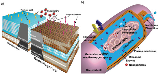 Nanoparticles may disrupt bacterial membranes and hinder biofilm formation [26,27]. The latter is important because the disruption of biofilms helps prevent bacterial resistance, since biofilms “shield” multiple microbes and serve as a hotbed for resistance mutations to develop [26]. The former is also important because contact with the bacterial cell is crucial before any remediating activity on the bacteria is possible [26]. Such contact is made possible through interactions such as hydrophobic interactions, van der Waals forces, receptor–ligand interactions, and electrostatic attraction [26,74]. Any damage to the cell wall or cell membrane make bacteria more vulnerable to the external environment [26]. After membrane disruption, interactions of the nanoparticles with the cellular contents of bacteria may further inflict damage on the bacteria. Such cellular components and targets include DNA, ribosomes, enzymes, other proteins, lysosomes, alterations in electrolyte balance, alterations in gene expression, and oxidative stress [26].