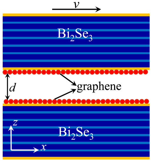 The schematic of the Casimir force between graphene-covered Bi2Se3 is shown in Figure 1. Two graphene-covered Bi2Se3 bulks are separated by a distance d . We assume the top graphene-covered Bi2Se3 moves relatively to the bottom one along the x-axis with a velocity v in the laboratory frame. The temperature of the surrounding environment is denoted by T, which is set to be T = 300 K in all the calculations. If the moving velocity of the top graphene-covered Bi2Se3 satisfies the conditions v < d k B T / , Casimir friction is proportional to the sliding velocity, which can be determined as f = γ v [18]. k B and are the Boltzmann and reduced Planck constants, respectively. γ = γ rad + γ evan is the Casimir friction coefficient, which comes from the contributions of propagation and evanescent electromagnetic waves from the graphene-covered Bi2Se3. However, the contribution of the propagation wave can be ignored in the near-field region [2,18]. Therefore, we only consider the Casimir friction coefficient from the evanescent waves, which can be expressed as [18]