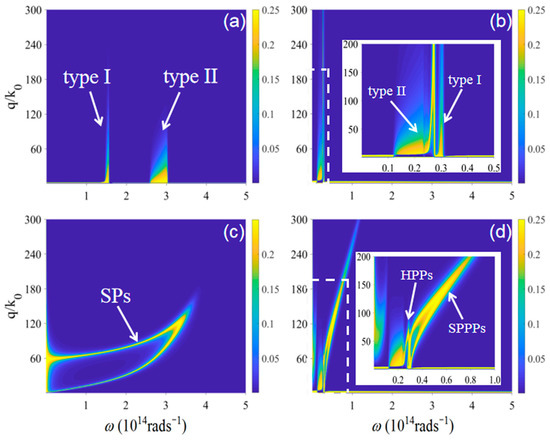 Figure 5. The photon exchange functions in different configurations. (a): hBN; (b): Bi2Se3; (c): graphene; (d): graphene-covered Bi2Se3. The chemical potential of graphene is μ = 0.2 eV and the separation distance is d = 20 nm. The insets in (b,d) are the enlarged areas denoted by white dashed lines.