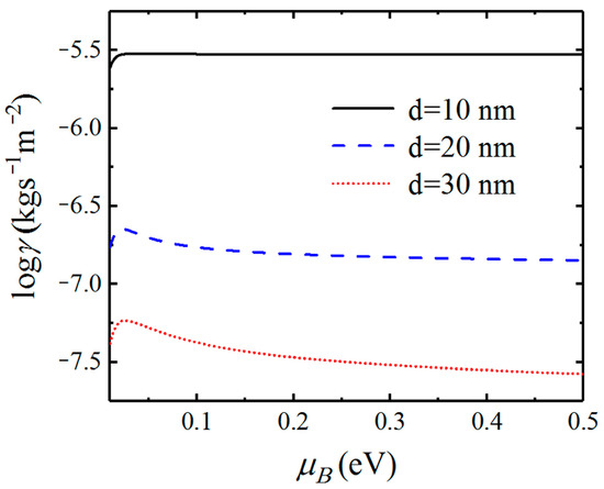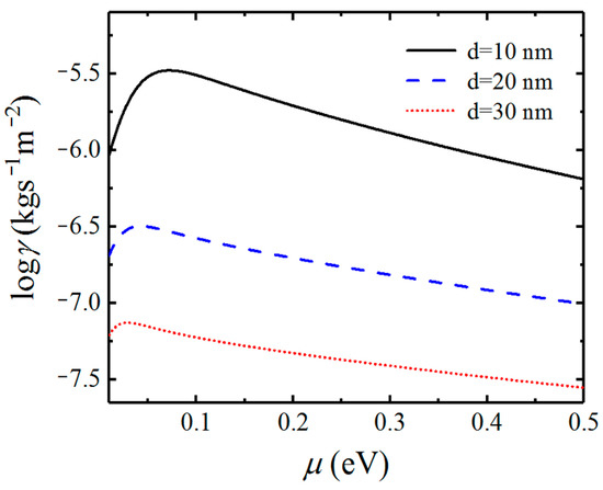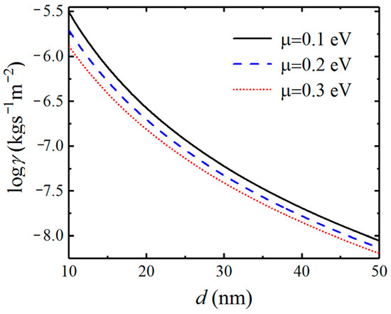 Because the characteristic of SPs excited by graphene as well as the coupled SPPPs is dependent on the chemical potential of graphene, we investigate the effect of chemical potential on the Casimir friction. In Figure 6, we display the friction coefficient on the separation distance d for different chemical potentials of graphene. The friction coefficient between graphene-covered Bi2Se3 with chemical potentials μ = 0.1 , μ = 0.2 , and μ = 0.3 eV are plotted in black solid, blue dashed, and red dotted lines, respectively. We can see that the friction coefficients varying with distance exhibit different behavior for different chemical potentials. As the distance increases, the difference of Casimir friction between systems with different chemical potentials becomes smaller, which means that the contribution from the evanescent SPPPs becomes weaker as the distance increases.