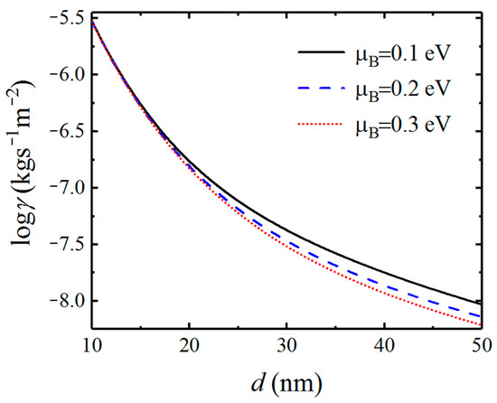 In Figure 9, we show the dependence of the Casimir friction coefficient on the separation distance d for different chemical potentials μ B of doped Bi2Se3, which is similar to that shown in Figure 6. We can see that the Casimir friction coefficient decreases rapidly with the increase in separation distance d . When the separation distance is less than 20 nm, the friction coefficient is not sensitive to the chemical potential. When the separation distance becomes larger, the friction coefficient decreases as the chemical potential increases. Such phenomenon is different from that between graphene-covered undoped Bi2Se3 which is shown in Figure 6. In addition, comparing Figure 9 with Figure 3, we can also see that the friction coefficient between doped Bi2Se3 is larger than that between undoped Bi2Se3 when the separation distance is less than 20 nm. However, when the separation is larger than 20 nm, the difference in Casimir friction between undoped Bi2Se3 and doped Bi2Se3 is very small.