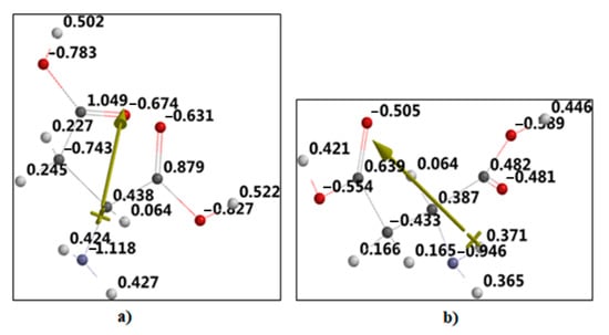 Electric charge distribution corresponding to optimized molecular structure in the two quantum-chemical approaches: (a) Hartree-Fock, (b) Density-Functional methods. Arrow represents the direction of the electrical dipole moment.