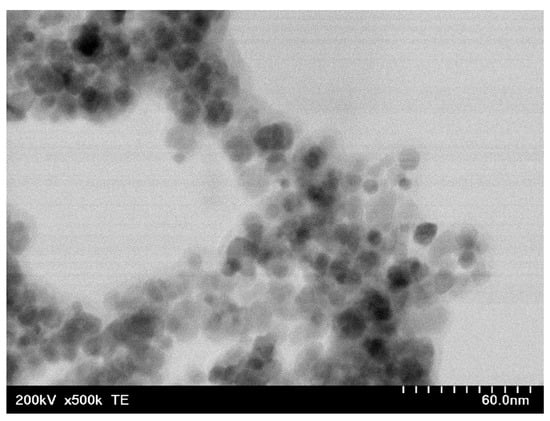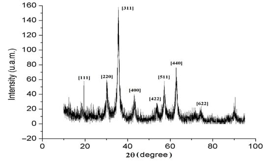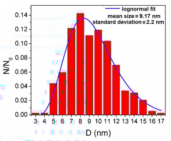 For the highest XRD peak (311) a crystallite size of about 8.9 nm was estimated, which is consistent with the mean size obtained from the TEM analyses. We did not notice significant differences for the full width at half the maximum values at different values of diffraction peaks; thus, we can suppose that the nanoparticles have a spherical shape. This can be also observed in TEM images (Figure 3).