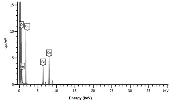 The elemental analysis of nanoparticles (EDS pattern) confirmed the presence of iron and oxygen (Figure 5). No other signal was identified, considering the EDS analysis threshold. The additional peaks correspond to copper from copper grid supports for the sample deposition during the TEM analysis.