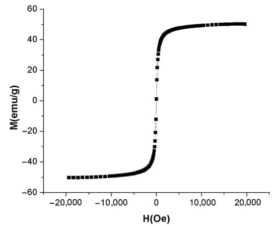 The magnetization curve of the synthesized A-IONPs sample is shown in Figure 7. From VSM experimental data, the saturation value of the specific magnetization of the A-IONP sample was about 50.19 emu/g, while the very low magnetic coercivity was about 3.071 Oe. Thus, we showed the superparamagnetic features of the A-IONPs.