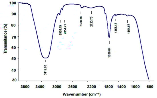 The broad absorption peak at 3312.93 cm−1 (Figure 9) can be attributed to stretching vibrations of OH and CH groups, as well as to NH groups that one can find in the theoretical calculated values of 3500−3550 cm−1 (Figure 8). The high intensity of this band in the experimental spectrum could suggest residual water molecules in the investigated sample. The weak peaks recorded at 2926.46 cm−1 and 2854.71 cm−1 suggest the presence of amide groups, and could correspond to the theoretical weak peaks at 2963, 2999, and 3011 cm−1.