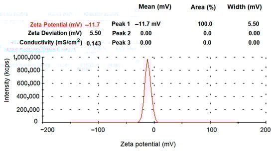 Figure 10 shows the zeta potential of A-IONPs. The measurement results showed that the A-IONPs had a zeta potential of about −11.7 mV. Since zeta potential is related to electrostatic repulsion, when steric mechanism also occurs, then suspension stability can be achieved at lower zeta potential—and this seems to be the case with our aspartic acid-coated magnetic nanoparticles [].