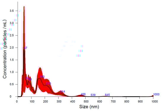 Hydrodynamic diameter seems to have a maximal appearance frequency of about 47 nm (Figure 11). Double modal size distribution could be noticed with secondary maximum at over 150 nm, which most probably correspond to rare large aggregates—the maximum being about three times smaller than the first one, at 47 nm. This is concordant with [], where individual nanoparticles were reported to have around 37 nm hydrodynamic diameter but larger size aggregates between 100 and 150 nm also were revealed.