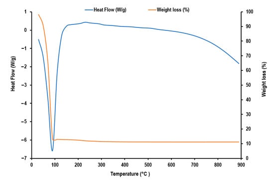 Heat flow (W/g) and weight loss (%) of A-IONPs sample are presented in Figure 12. The first decomposition stage in the temperature range from 20 °C to 100 °C represents the solvent evaporation—water residues in our sample, the weight decreasing up to 13.1% from the initial one around of 85 °C. The second important interval for the temperature ranging between 180–265 °C corresponds to the organic breakdown of aspartate chains, the weight decreasing up to 11.2% of the initial one. The total weight losses up to 400 °C were 88.8%, and over 400 °C the weight of sample remained constant. The DSC curve has several exothermic peaks. Of these, the first two correspond to more pronounced weight loss (decreases from 13.1% to 11.2%) which might have occurred because of thermal decomposition of aspartic acid [].