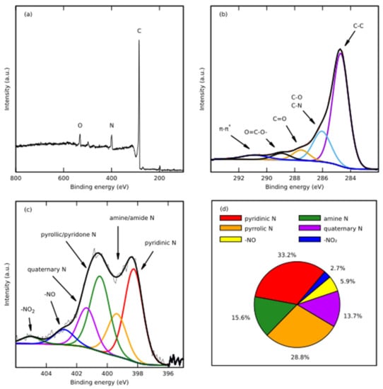 The chemical composition of CH_K was investigated by X-ray photoemission spectroscopy (XPS) (Figure 5). Three distinct peaks at around 532 eV, 400 eV, and 285 eV, corresponding to O 1s, N 1s, and C 1s, respectively, were observed in the XPS survey spectra (Figure 5a). The high-resolution C 1s spectrum can be additionally deconvoluted into five peaks corresponding to C–C (284.7 eV), C–O/C–N (286.0 eV), C=O (287.5 eV), O=C–O (288.9 eV), and π-π* (290.7 eV) (Figure 5b). Deconvolution of the high-resolution N 1s spectrum into six specific peaks was also performed (Figure 5c). The peaks can be attributed to the pyridinic N (398.3 eV), amine/amide N (399.4 eV), pyrollic/pyridone N (400.7 eV), and quaternary N (401.5 eV); and the latter ones to –NO and –NO2 functional groups. The pyrollic and pyridone N constitute the highest atomic percentage i.e., 33.2 and 28.8%, respectively, in the material (Figure 5d). The XPS analysis confirms the successful doping of N into the carbon material. It was reported that the presence of the pyrollic and pyridone N at the edge of the carbon skeleton significantly increases the capacitive performance of the material [40].