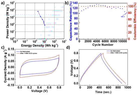 (a) Ragone plot of the fabricated supercapacitor. (b) The capacity retention of the fabricated supercapacitor was measured with a constant GCD at 1.0 A g−1 over a voltage range of 0–0.8 V. Comparison of (c) CV and (d) GCD of as-fabricated and supercapacitors tested over 11,000 cycles.