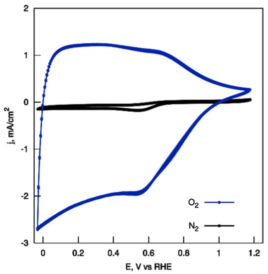 The ORR catalytic activity of the CH_K material was initially investigated using CV measurements in O2 or N2 saturated 0.1 M KOH at a scan rate of 10 mV/s (Figure 8). A voltammogram with only a minute cathodic peak was obtained for the catalyst in the absence of oxygen. After saturating the solution with oxygen, a wave of the reduction current of ca. 2 mA/cm2 can be seen at potentials lower than 0.55 V.