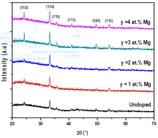 The influence of Mg-doping on the crystalline structure of the as-synthesized iron oxide composites was examined by X-ray diffraction. As shown in Figure 1, six diffraction peaks located at 2θ = 24.23, 33.24, 35.75, 44.99, 49.56, and 54.18° can be observed in the XRD patterns of the undoped and Mg-doped Fe2O3 thin films, corresponding to the (012), (104), (110), (113), (024), and (116) planes, respectively, of a typical α-Fe2O3 phase structure (rhombohedral, R-3C, a = b = 5.023 Å, c = 13.70 Å; JCPDS Card No. 01-089-8104) [28,29]. No new peak formation was observed, which confirms that magnesium has been successfully substituted into the Fe2O3 matrix. The X-ray analysis shows that all films are polycrystalline and have a preferential orientation along the (104) plane, regardless of the Mg doping level. A slight shift to higher diffraction angles was detected in the XRD scans of the doped samples, especially for 1 at.% and 2 at.%. The shift was attributed to the seamless incorporation of magnesium ions into the Fe2O3 structure, due to the smaller ionic radius of Mg2+ compared to Fe3+ [30,31]. We note that the highest intensity of the principal orientation was obtained at 3 at.% Mg doping concentration.