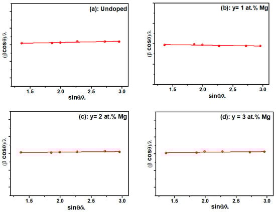 Williamson–Hall plots for the undoped and Mg-doped Fe2O3 thin films.