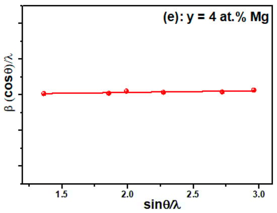 where β is FWHM in radian, D is the grain size in nanometers, ε is the microstrain, and λ is X-ray wavelength in nanometers. The values estimated from Figure 3 are presented in Table 1, which shows that D decreased from 60.8 nm to 55.3 nm regardless of the doping concentration. Consequently, the microstrain increased from 0.31 × 10−3 to 0.64 × 10−3. The decrease in the lattice parameters (a,c) and cell volume (V) presented in Table 1 is expected due to the stoechiometric replacement of Fe ions with Mg ions with smaller ionic radii. The smallest volume, V, was obtained for y = 3 at.%, corresponding to the best crystalline quality (Figure 1 and Figure 2), which is also in agreement with the substitution of Fe by Mg in the lattice [33].
