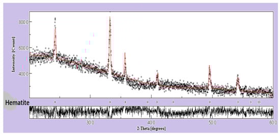 Rietveld analysis (using MAUD software) was used for the 3 at.% Mg-doped Fe2O3 thin films to check the α-Fe2O3 phase purity. The refinement plot is shown in Figure 4, which represents the experimental pattern as black dots and the pattern calculated with Rietveld refinement as red solid lines. In addition, the lower part of the graph indicates the difference between the values of experimental and calculated intensities. The structural fitting quality was checked by the goodness-of-fit factor (GoF = Rwp/Rexp), where Rwp is the weighted residual error and Rexp is the expected error. The GoF was found to be 1.26, which describes a well-fitting model with low discrepancies between the experimental and calculated XRD patterns [7,35]. The results obtained confirm that the Fe ion was substituted by the Mg ion in the Fe2O3 phase.