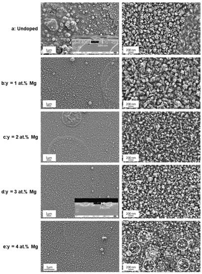 The effect of magnesium doping on the morphology of Fe2O3 films is shown in Figure 5a–e. The SEM micrographs show a granular morphology with a uniform distribution through the substrate surface for the undoped and doped samples. A similar morphology was mentioned in literature [5,22,28]. The cross-section images show a compact and homogenous textured film with a thickness of about 384 and 340 nm for undoped Fe2O3 and 3 at.% Mg-doped Fe2O3, respectively (Figure 5a,d). No defects are observed on the samples surface. The undoped films appear to have a randomly distributed grain agglomeration on the surface of the film. The Mg-doped films show a more uniform distribution with smaller grain size compared to the undoped films, which recommends them for photocatalysis applications [36]. At a higher Mg-doping concentration, the rhombohedral shape of the grains appears more clearly defined (inset Figure 5d,e).