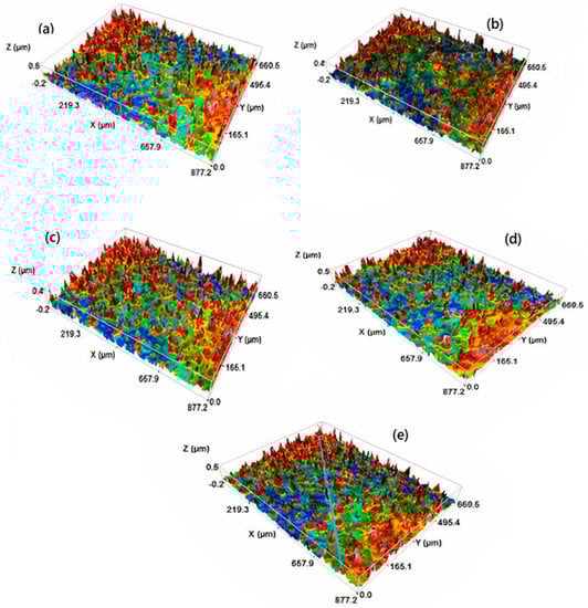 In order to better understand the effect of Mg doping on the morphological properties of the Fe2O3 thin films, the topography evolution of the deposited films was investigated using confocal microscope (CM). Figure 6 presents the 3D CM images of the thin films. Overall, these images are in agreement with those observed by SEM (Figure 5). The 3D micrographs show a homogenous layer free from voids and cracks. The surface roughness parameters, including the root mean square (Sq) and arithmetic average of absolute values (Sa), were extracted from CM data. The values of surface roughness of undoped and Mg-doped Fe2O3 thin films as a function of Mg concentrations are given at Table 2. The Sa and Sq values vary in the range [60.6–76.6] nm and [80.6–104.1] nm, respectively. Mg-doped Fe2O3 layers have a relatively high surface roughness, which can offer more available active sites and, consequently, improve the adsorption of pollutants during the photocatalysis process [18]. The highest values of Sa and Sq were obtained for a Mg content of 3 at.% (Table 2).