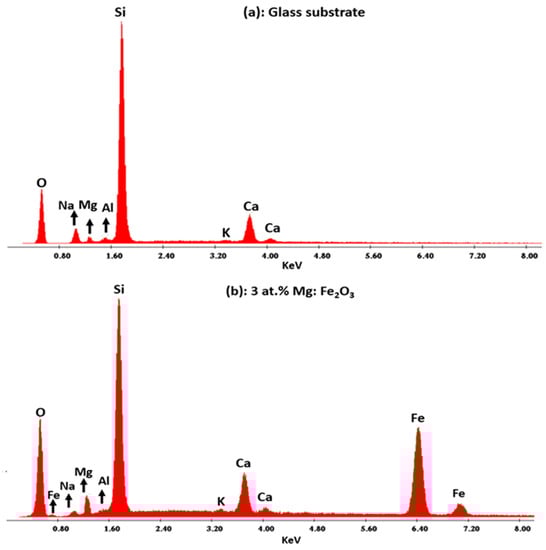The EDS spectra of the glass substrate and 3 at.% Mg-doped Fe2O3 film shown in Figure 7 reveal many peaks. The EDS analysis confirmed the presence of the expected elements, iron (Fe), magnesium (Mg), and oxygen (O), all in addition to those attributed to glass substrate, confirming the grown layer free from impurities.