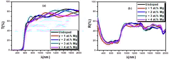 To investigate the doping effect of Mg (y = 1, 2, 3, and 4 at.%) on the optical properties of Fe2O3 thin films, transmission (T(λ)) and reflection (R(λ)) measurements were carried out. The T (λ) and R(λ) spectra are presented in Figure 8, which shows that the as-deposited films have a high transmission coefficient (≥60%) within the interval of 1000–2500 nm. Below 650 nm, a sharp fall in all the R–T spectra is observed, which is due to the very strong absorption of these films in the UV and most of the visible light region. Remarkably, in the SEM cross- section images (Figure 5), interference fringes are observed in the transmission spectra, referring to the films excellent thickness homogeneity [22,28]. The optical reflection data allow the estimation of the band gap values through the differential reflectance spectra (dR/dλ) as a function of wavelength. The optical direct (Edir) and indirect (Eind) band gaps values obtained for Fe2O3 and Mg-doped iron oxide semiconductor are typical of those for Fe2O3 (Table 3) [7]. No significant variation was observed for indirect transition (Eind), but a slight increase of the direct transition value (Edir) with Mg doping content was observed from 2.15 eV for Fe2O3 to 2.20 eV for 3 at.% Mg-doped Fe2O3 (Table 3). We observed that the films crystallinity improved with the Mg insertion (Figure 1). In addition, a slight increase in the direct band gap was noticed, to reach a maximum value equal to 0.05 eV with a magnesium doping ratio equal to 3 at.%. This finding is in good correlation with the crystallinity observed at the same doping ratio, which reduced the structural defects.