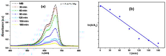As a result, the linked works of the photogenerated electrons and holes cause the MB degradation, where the e- reacts with oxygen molecules to produce superoxide anion radicals (O2°−) and the h+ reacts with water to form hydroxyl radicals. The inserted magnesium ions act like a charge sink, which consequently can enhance the separation of the photogenerated charge pairs, giving rise to further superoxide and hydroxyl radicals, leading to an enhancement in the photocatalytic degradation efficiency. Many researchers have reported that the activity of semiconductor materials in dye degradation processes is affected by metal transition dopants [13,17,18]. In order to investigate the kinetic of MB photodecomposition on the catalyst surface, Figure 9b shows the curve fitting of the kinetic equation. A straight line was obtained, indicating that the reaction is of pseudo-first order. Thus, 3 at.% Mg-doped Fe2O3 thin layer presents a performant photocatalyst.