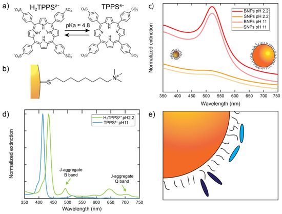 Components of the hybrid systems. (a) Molecular structures of diprotonated and free base porphyrin, labelled H2TPPS2−, and TPPS4−, respectively. (b) Representation of the TMAO-SH capping layer molecule. (c) Extinction spectra of big (BNPs) and small (SNPs) nanoparticles at different pH. The spectra are shifted vertically to ease the comparison. The cartoons of big and small nanoparticles are represented in scale. (d) Normalized extinction spectra of H2TPPS2− at pH = 2.2 and of TPPS4− at pH = 11 (1 μM solutions in MilliQ water). The two arrows indicate the B and Q bands of TPPS J-aggregate, allowing them to be distinguished from the bands of the monomer. (e) Schematic representation of the perpendicular (dark blue) and parallel (light blue) orientation of the porphyrins on a nanoparticle surface.