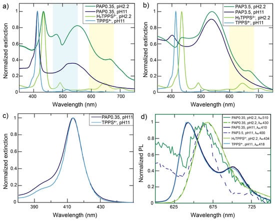 Overall perspective of the extinction and emission spectra of BNPs. (a) Extinction spectra of the hybrids at PAP = 0.35 nm2. H2TPPS2− and TPPS4− absorption spectra at pH 11 and 2.2, respectively, are reported as references. (b) Same as (a) but for PAP = 3.5 nm2. The blue (yellow) area highlights the presence of B (Q) plexciton resonances. (c) Comparison between the normalized extinction spectra of TPPS4− and BNPs at PAP = 0.35 nm2 and at pH = 11. A constant baseline subtraction has been performed to ease the comparison. The TPPS4− absorption spectrum is reported as a reference. (d) Normalized emission spectra of nanohybrids in different conditions compared with the emission spectra of H2TPPS2− (pH = 2.2) and TPPS4− (pH = 11). The excitation wavelengths are reported in nm.