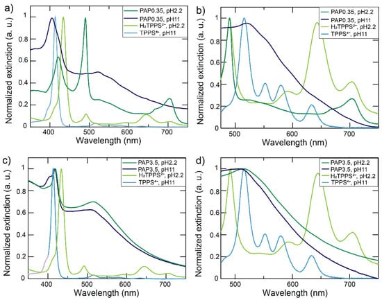 At a basic pH (Figure 3a,b), the extinction spectra revealed instead the presence of H-aggregates, indicated by the band at 403 nm, and TPPS4− monomers (band at 419 nm).
