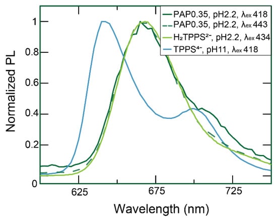 At an acidic pH, extinction spectra indicated that J-aggregates (peaks at 490 nm and 705 nm) were predominant. Fluorescence spectra confirmed their presence but revealed the additional presence of residual H2TPPS2− monomers (Figure 4): upon excitation at 418 nm, we observed the typical emission of H2TPPS2− monomers and a shoulder at 710 nm, characteristic of the J-aggregates [15,17], while excitation at 434 nm produced only the monomeric H2TPPS2− emission spectrum.