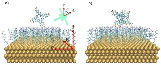 It is relevant to note that the building up of an effective plexcitonic coupling requires that the transition dipole moments of the surface plasmons in the nanoparticle and the dyes are parallel [72]. For spherical NPs, the largest coupling is obtained when the transition dipoles of the dyes are orthogonal to the particle surface [73,74]. In our case, the porphyrin had two degenerate and perpendicular transition dipole moments, both laying on the molecular plane [1]. Therefore, it could be reasonably supposed that plexcitonic coupling in this system could be effectively established when the porphyrin molecular plane was perpendicular (or slightly tilted) to the NP’s surface. As we will discuss later, while such an arrangement is quite expected in the case of J-aggregates, it is not obvious in the case of monomers.