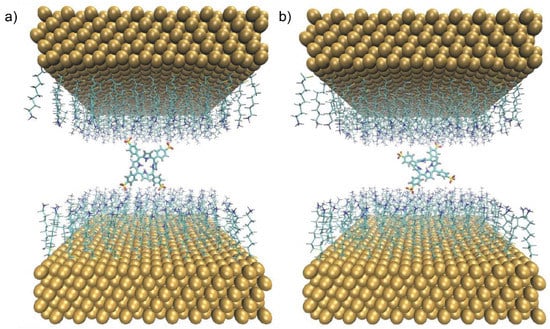 Plain 1.0 nm cut-offs were applied for van der Waals and short-range electrostatic interactions. Long-range electrostatics were treated by means of the particle mesh Ewald method (PME) [63]. When dealing with the Au (111) surface, the PME method was combined with the correction proposed by Yeh and Berkowitz [64], which gives more accurate results for systems with slab geometry. To improve efficiency and reduce interactions with the periodic images in the z-direction, the simulation box was made at least three-times thicker than the real system [64], which was eventually sandwiched between two vacuum layers of the same size. For simulations involving only one functionalized surface, a second, plain Au slab was used to delimit the system on the upper face to avoid a surface–vacuum interface: this arrangement is also consistent with the one considered by Yeh and Berkowitz (water between two Pt walls) [64].