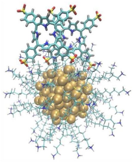 MD simulations confirmed that, regardless of the initial orientation, there is a marked tendency of H2TPPS2− to form ion-pair interactions with ligands of two particles in a bridging arrangement between the two capping layers. This remains true even when the molecule, as for the larger box, possesses enough space to reorient freely or to lay preferentially closer to one surface [24].
