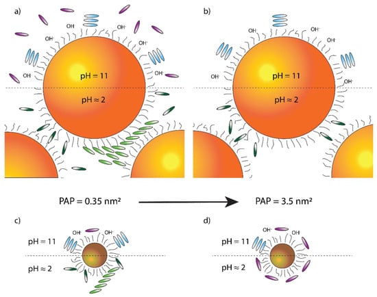 Surprisingly enough, in subsaturation conditions (PAP = 3.5 nm2, Figure 3c,d), the dye was always present as TPPS4−, irrespective of the pH. At an acidic pH (pH 2.2), only nanoparticle-bound TPPS4− monomers were observed. Effective binding of TPPS4− to the nanoparticles was confirmed by the fact that the samples were not fluorescent (data not shown), because of the quenching properties of the NPs [78]. Moreover, it must be noted that the position of the B band was red-shifted by 5 nm (from 414 nm to 419 nm). This suggests a certain degree of interaction between the conjugated aromatic rings of the porphyrin and the surface of the nanoparticle through phenomena like the image charge effect [79,80] or electromagnetic interactions [81].