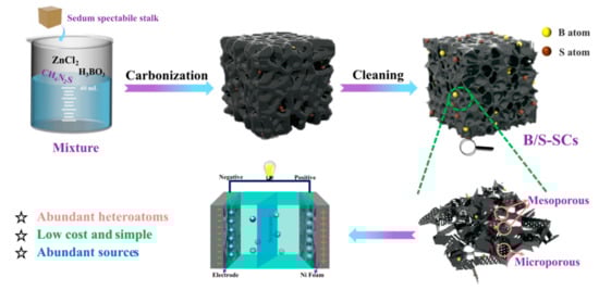 H3BO3 is a green boron dopant because of its low toxicity. It is envisaged that B atoms are introduced into biomass carbon using boric acid as a dopant. Additionally, it has been reported that when S and B are co-doped, the chemical interaction will be enhanced; additionally, the content of B will be raised [], thereby enhancing electrochemical performance. In this paper, boron/sulfur co-doped porous carbon (B/S-SCS-1) was prepared by using the ZnCl2 activation process using boric acid and thiourea as B and S sources and sedum stem as raw materials for the electrode material of the supercapacitor. The prepared samples showed porous structures with interconnections and an abundant surface heteroatomic content. When only boron was doped, the content of the B atom was only 0.61%. While B/S was co-doped, the B content increased to 5.56%. When utilized as the electrode material for a supercapacitor in 6 M KOH, B/S-SCS-1 realizes a specific capacitance of 290.7 F g−1 at 0.5 A g−1, and the 1 M Na2SO4 utilized as the electrolyte in the assembled B/S-SCS-1//B/S-SCS-1 symmetric supercapacitor showed great specific energy of 16.65 Wh kg−1 at 450 W kg−1. To explore the universality of this program, the same scheme was used to synthesize porous carbon with three other types of biomass wastes—walnut peel, wheat straw, and corn stalk—to verify the versatility of the method. This work provides a reference for the more convenient and lower-cost synthesis of porous carbon from biomass.