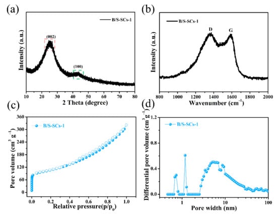 (a) XRD pattern; (b) Raman spectra; (c) nitrogen adsorption/desorption isotherm; (d) pore size distribution of the obtained B/S-SCS-1 electrode.