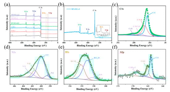 (a) XPS spectra of all samples; (b) XPS spectra of the B/S-SCS-1; (c) high-quality C 1s XPS images of B/S-SCS-1; (d) high-quality N 1s XPS images of B/S-SCS-1; (e) high-resolution B 1s XPS images of B/S-SCS-1; (f) high-quality S 2p XPS images of B/S-SCS-1.
