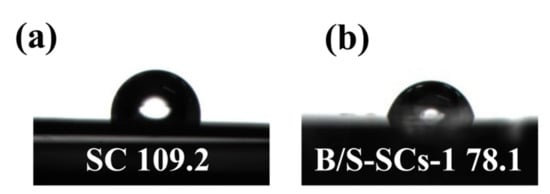 The contact angles formed by water drops on the surface of (a) SC and (b) B/S-SCS-1.