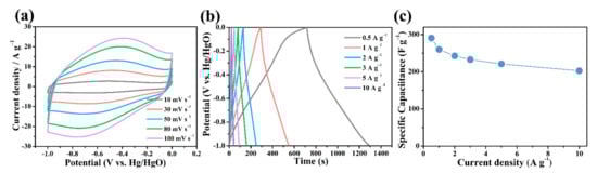 Figure 6a shows the CV curve of B/S-SCS-1 at different scan rates; it can be observed from this figure that the B/S-SCS-1 electrode exhibited a broad peak in the potential range of −1 to 0 V, which suggests that the existence of superficial hetero atoms in large numbers is conducive to the formation of significant pseudocapacitance. There are two possible causes for these phenomena. On the one hand, a greater number of active heteroatoms (especially B, S) not only increase pseudocapacitance but also expose more ions on the hydrophilic surface while expanding the area of the CV ring. On the other hand, the three-dimensional porous structure promotes the conduction of electrons and improves the charge transfer []. Figure 6b shows the GCD diagram of B/S-SCS-1 at varying current densities. At each level of current density, the constant current charge–discharge curve corresponded to the CV curve, despite a slight deformation and a quasi-symmetrical triangle, indicating the reliable reversibility and the existence of both EDLC and pseudocapacitance. In addition, the ratio capacitances of the B/S-SCS-1 electrode diminished with the elevation of the current density, as shown in Figure 6c, which results from the reinforced diffusional limitation and lesser ionic transport time under the increased current density []. B/S-SCS-1 showed a maximum ratio capacitance of 290.7 F g−1 at 0.5 A g−1 and exhibited an even higher capacitor retention of 70%, even at 10 A g−1, suggesting a remarkable performance. The electrochemical performance of B/S-SCS-1 is also extremely excellent compared with previous research works (Table 2). It can thus be inferred that the heteroatom-rich electrode can not only help enhance pseudocapacitance but also improve the contact probabilities between the electrode and the electrolyte, thus ensuring a large effective surface for charge storage. Ultimately, an excellent rate of performance can be achieved for the electrode.