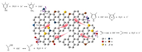 B/S-SCS-1 performs well at a specific capacitance, which is attributable to the synergistic effect produced by various heteroatoms. Figure 7 illustrates the mechanism followed by the synergistic effect of B and S doping on the increased capacitance for B/S-SCS-1. According to a previous report [], the oxygen-containing groups can improve wettability and pseudocapacitance (the possible redox reactions are shown in Figure 7). The nitrogen functional groups, where N acts as heteroatoms, could ensure steady pseudocapacitance, possibly ascribed to amine groups’ redox reactions [], as shown in Figure 7. Additionally, the B heteroatom could be treated as an electrocatalyst to accelerate the oxidation-reduction reaction of oxygen and nitrogen functional groups, thus further improving pseudocapacitance [,]. Particularly, the substitutions of carbon with boron in the carbon materials lattice cause a downward shift to the Fermi level, thereby enhancing charge storage and transfer within the structure of doped carbon materials []. The contribution of the S atom to the electrochemical property could be attributed to the introduction of C-S, which enables the n-type dopant S to provide more reversible false sites and polarized surfaces []. In addition, sulfur-containing functional groups can be used as a support framework for larger pores at high temperatures to reduce the shrinkage of micropores during carbonization, which enables fast ion transmission (the possible groups are displayed in Figure 7) [].